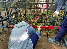Для начала мы срезали ограждение и начертили эскиз уголков, предварительно согласовав свои действия с клиентом. После этого мы дождались одобрения рисунка и приступили к работе.