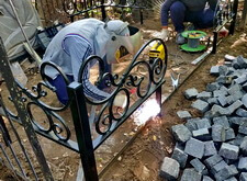 Монтируем оградку, вваривая согласованные с клиентом уголки. По низу пускаем металлическую ленту, которая обозначит границу выложенной брусчаткой территории.