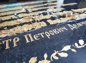 При помощи лезвия от канцелярского ножа мы зачищаем надпись – здесь важно не поцарапать гранит, но в то же время давить с достаточной силой, чтобы соскрести лишнее золото с каменной поверхности.